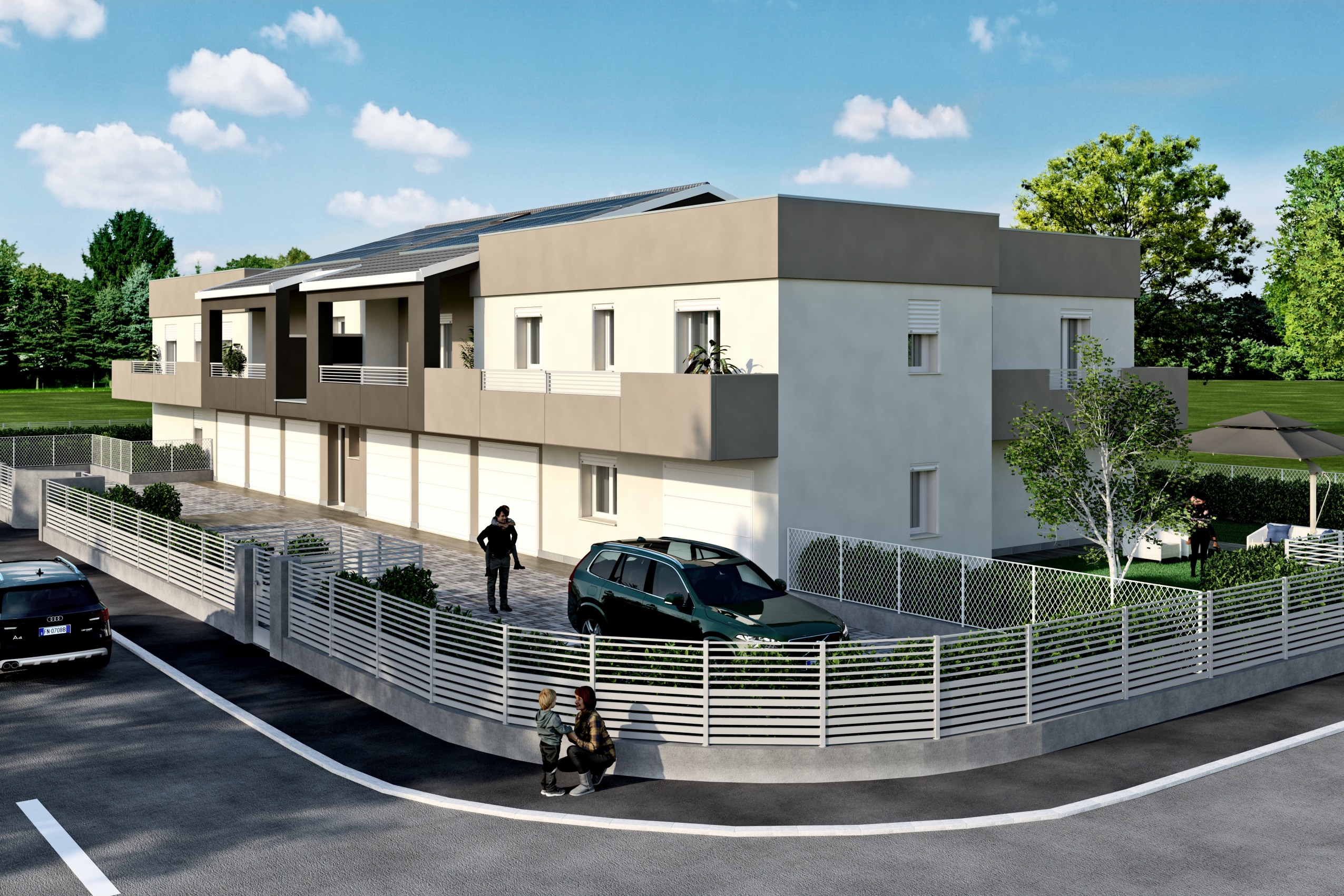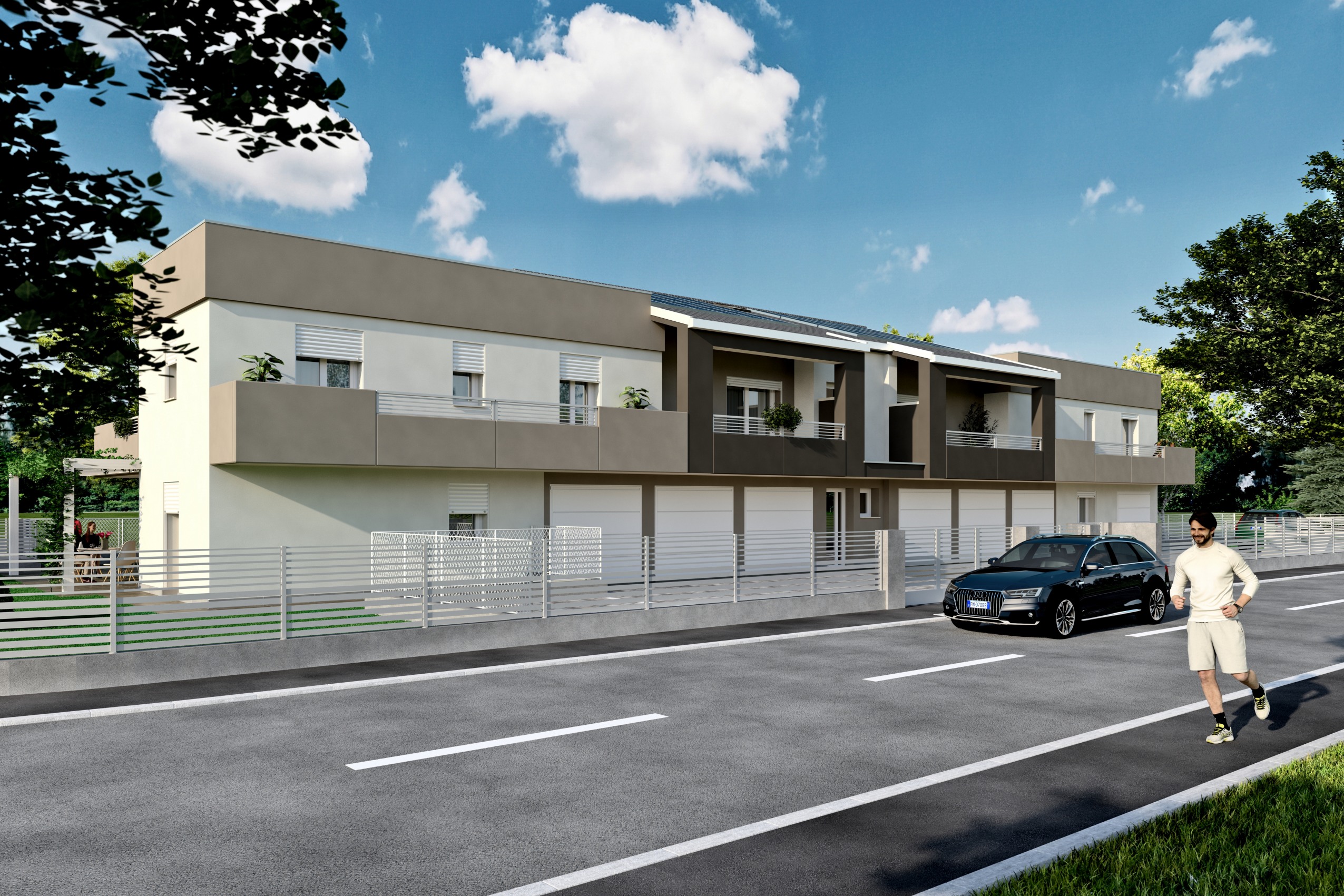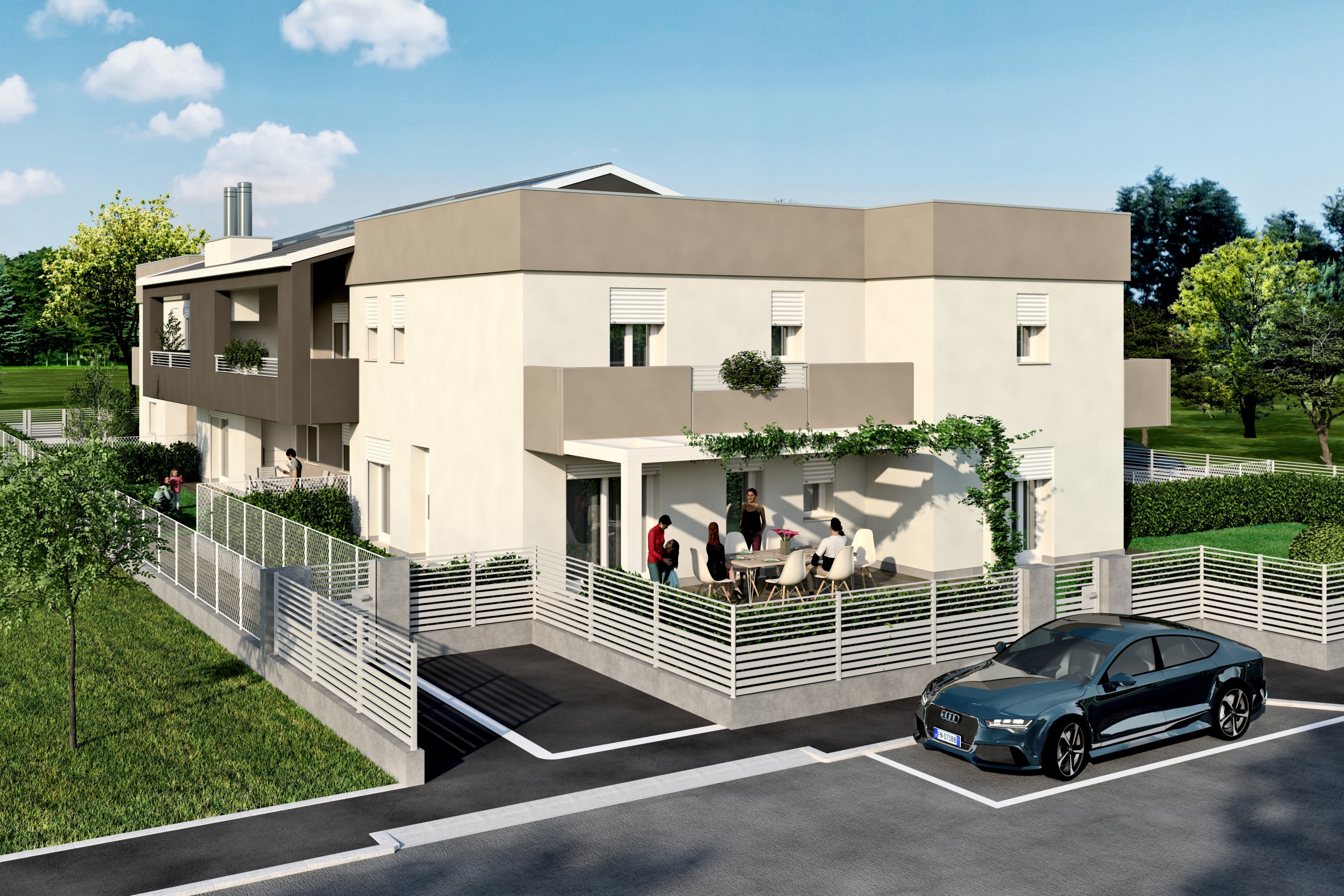 Vendesi appartamenti al piano terra con giardino privato, entrata pedonale indipendente ed entrata carraia indipendente, con soggiorno e cucina, due o tre camere da letto, due bagni, disimpegno. Garage e posto auto.